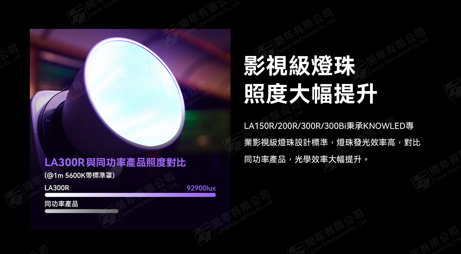 LA150R/200R/300R/300Bi秉承KNOWLED專業影視級燈珠設計標準,燈珠發光效率高,對比同功率產品,光學效率大幅提升。