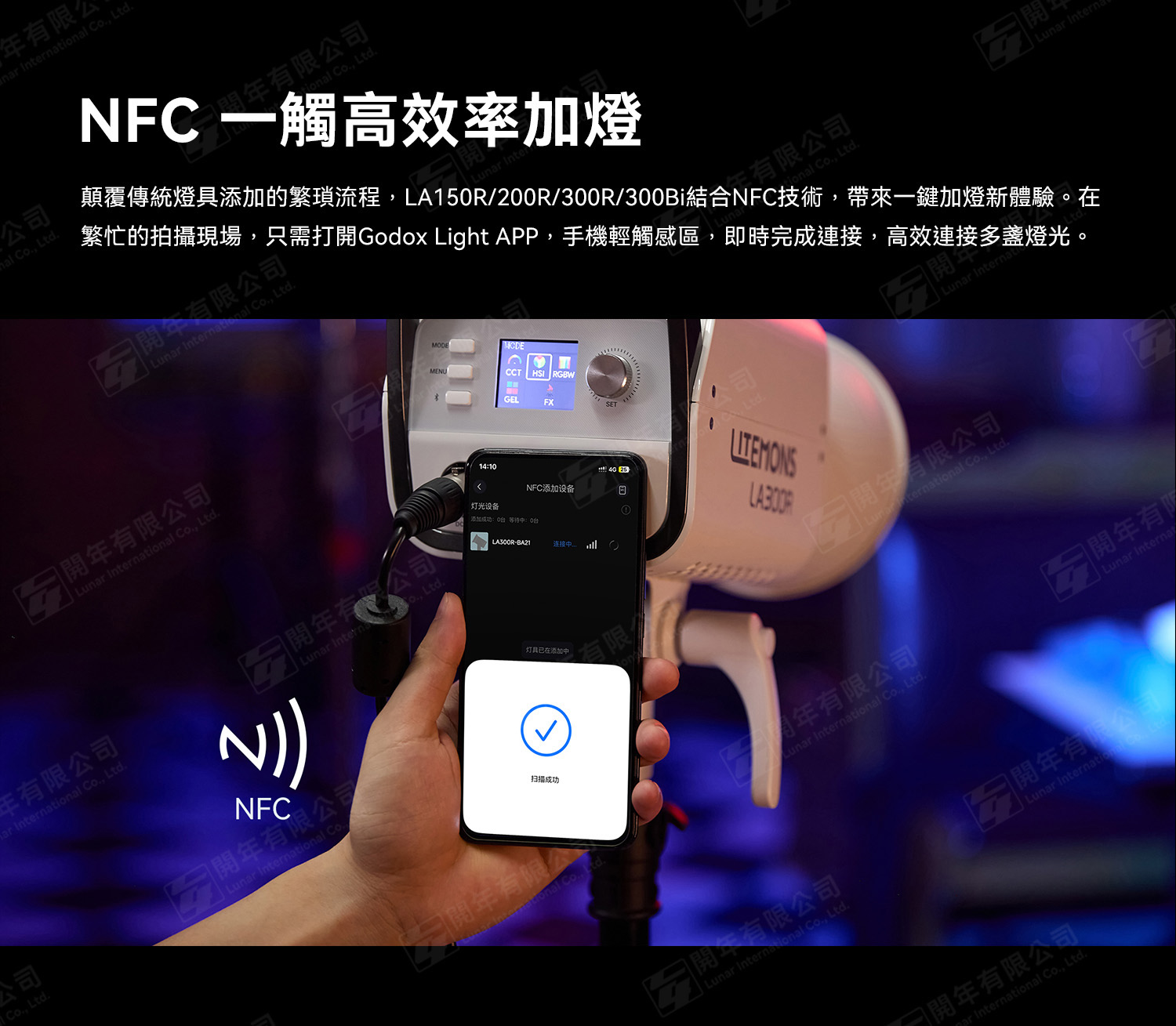 顛覆傳統燈具添加的繁瑣流程,LA150R/200R/300R/300Bi結合NFC技術,帶來一鍵加燈新體驗。在繁忙的拍攝現場,只需打開Godox Light APP,手機輕觸感區,即時完成連接,高效連接多盞燈光。
